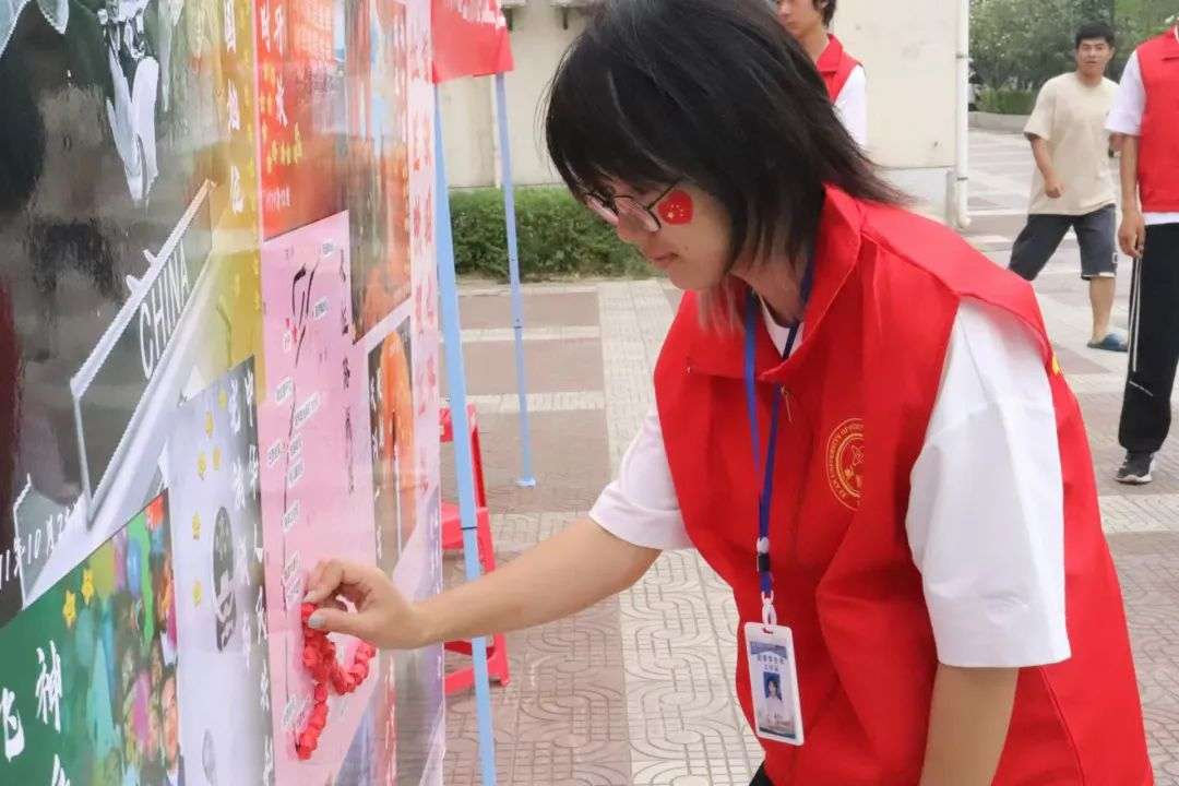 同时,将金黄色的五角星粘贴于展示建国以来国家重大历史事件的展板之上,同学们以这种方式”点亮“建国征程,表达同学们铭记历史,歌颂祖国的爱国情怀。每一颗星都象征着一段光辉历程,每一次粘贴都是对历史的深刻铭记与对祖国的崇高颂扬。