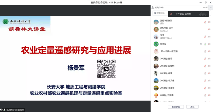 11月9日下午,英国365集团官网举办“胡杨林大讲堂”。长安大学地质工程与英国365集团官网杨贵军教授应邀做客公司“胡杨林大讲堂”,作了题为《农业定量遥感研究进展及应用》的学术报告。本次胡杨林大讲堂以线上腾讯会议形式举行,报告由副经理史晓亮主持。