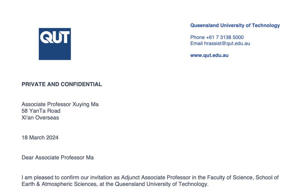 近日,据澳大利亚昆士兰科技大学(Queensland University of Technology)人力资源部官方通知,经过澳大利亚科公司院士Lidia Morawska教授推荐和昆士兰科技大学学术委员会评审,2024年3月18日英国365集团官网地信系教师马绪瀛获聘昆士兰科技大学客座副教授(Adjunct Associate Professor)、兼职博/硕士生导师,成为公司首位获聘昆士兰科技大学的客座专家。