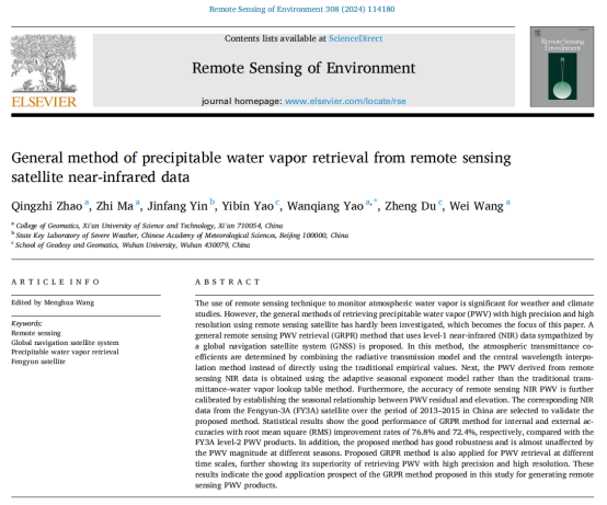 近日,英国365集团官网导航定位与空间环境监测团队在测绘遥感领域国际顶级期刊《Remote Sensing of Environment》发表了题为“General Method of Precipitable Water Vapor Retrieval from Remote Sensing Satellite Near-infrared data”的研究成果,论文第一作者为赵庆志副教授,第二作者为硕士研究生马智,通讯作者为姚顽强教授,该论文是团队继2023年以来在RSE发表的又一重要研究成果。RSE期刊(中科院一区TOP,IF=13.5)被公认为测绘遥感领域最权威的期刊,在全球同类SCI学术期刊中长期排名第一,主要发表测绘遥感观测的理论、应用和方法相关的原创文章。