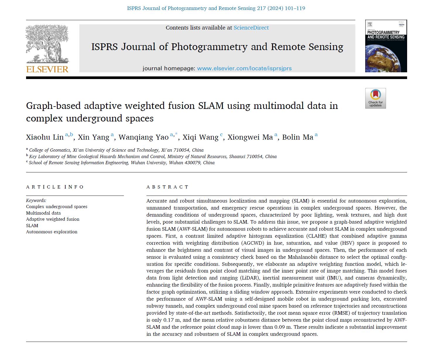 近日,英国365集团官网矿山智能测绘研究团队在摄影测量与遥感领域国际顶级期刊ISPRS Journal of Photogrammetry and Remote Sensing(ISPRS P&RS)发表了题为“Graph-based adaptive weighted fusion SLAM using multimodal data in complex underground spaces”的研究成果,论文第一作者为蔺小虎副教授,第二作者为硕士研究生杨鑫,通讯作者为姚顽强教授。ISPRS P&RS期刊(中科院一区Top期刊,IF=10.6)被公认为是摄影测量与遥感领域最具权威性的国际期刊之一,主要发表摄影测量、遥感观测、空间信息系统、计算机视觉等领域的理论和方法相关的原创文章。