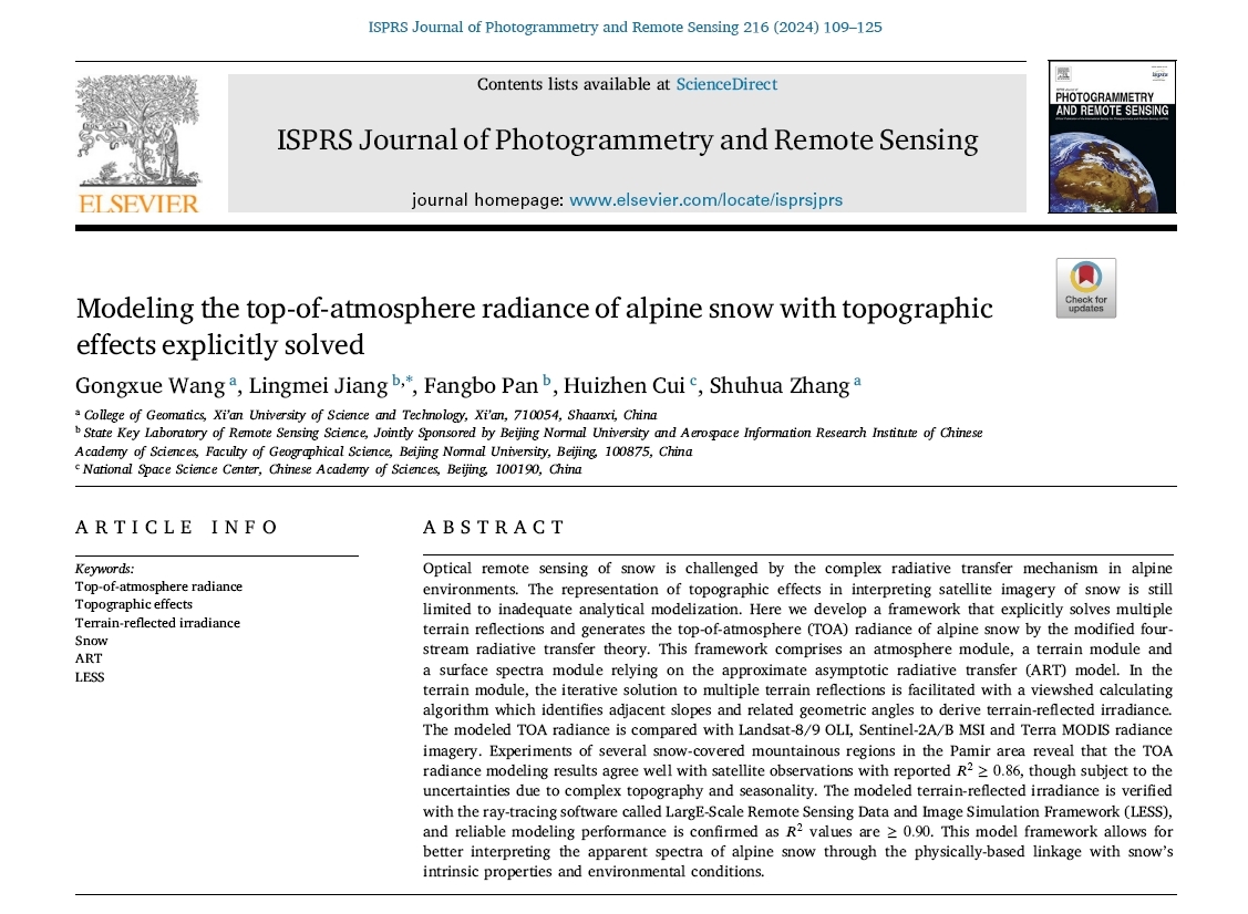近日,英国365集团官网矿区定量遥感研究团队在摄影测量与遥感领域国际顶级期刊ISPRS Journal of Photogrammetry and Remote Sensing(ISPRS P&RS)发表了题为“Modeling the top-of-atmosphere radiance of alpine snow with topographic effects explicitly solved”的研究成果,王功雪讲师为第一作者,张淑花副教授为共同作者。ISPRS P&RS期刊(中科院一区Top期刊,IF=10.6)被公认为是摄影测量与遥感领域最具权威性的国际期刊之一,主要发表摄影测量、遥感观测、空间信息系统、计算机视觉等领域的理论和方法相关的原创文章。